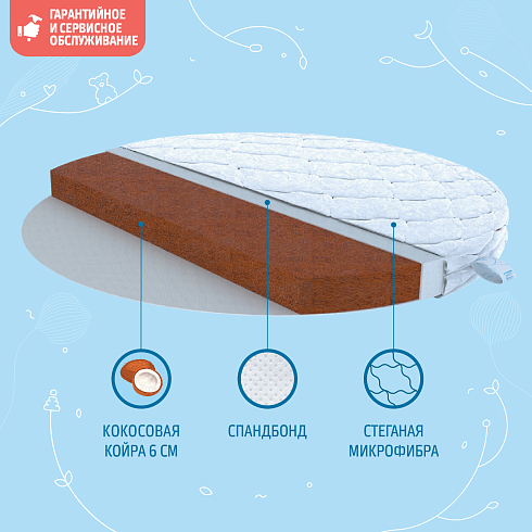 Детский матрас Nuovita Coco Rodondo. Максимальная нагрузка на матрас 30 кг. Состав наполнителя: кокос 6 см + спанбонд. Жесткость матраса "высокая". Чехол матраса съёмный, выполнен из стеганного трикотажного полотна.