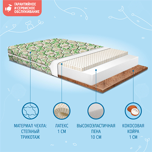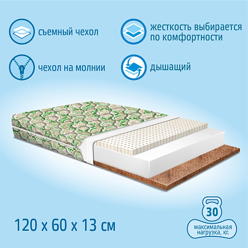 Детский матрас Nuovita Cespo Alhambra 120x60 см выдерживает нагрузку до 30 кг. Высота матраса 13 см (кокос 1см + Schiuma Elastica 10 см + латекс 2 см.), склеивание выполнено по технологии "Hot-Melt". Разная жесткость сторон ("средняя" и "жесткая").