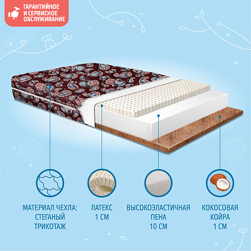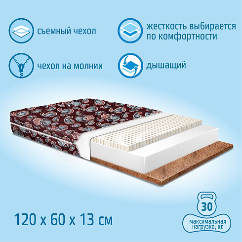 Детский матрас Nuovita Cespo Hamsa 120x60 см выдерживает нагрузку до 30 кг. Высота матраса 13 см (Кокос 2 см + Schiuma Elastica 10 см + латекс 2 см.), склеивание выполнено по технологии "Hot-Melt". Разная жесткость сторон ("средняя" и "жесткая").