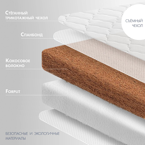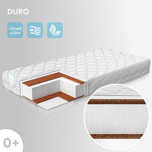 Детский матрас Nuovita Duro. Максимальная нагрузка на матрас 30 кг. Состав наполнителя: кокос 1 см + Forplit 10 см + кокос 1 см + спанбонд. Жесткость матраса "средняя". Чехол матраса съёмный, выполнен из стеганного трикотажного полотна.