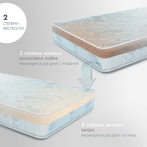 Детский матрас Nuovita Morbido. Максимальная нагрузка на матрас 30 кг. Состав наполнителя: латекс 1 см + Forplit 10 см + кокос 1 см + спанбонд. Жесткость матраса "средняя". Чехол матраса съёмный, выполнен из стеганного трикотажного полотна.