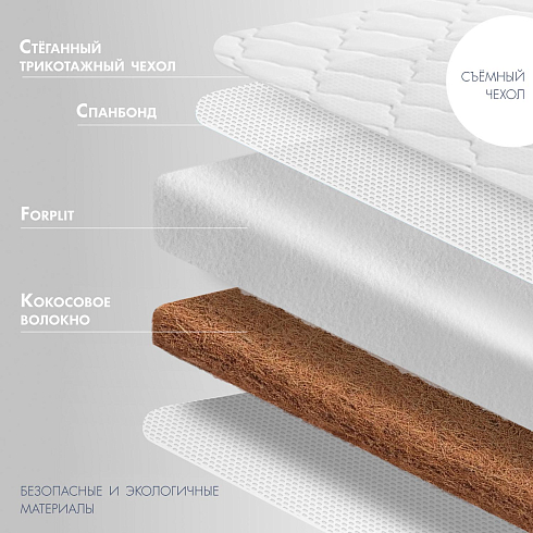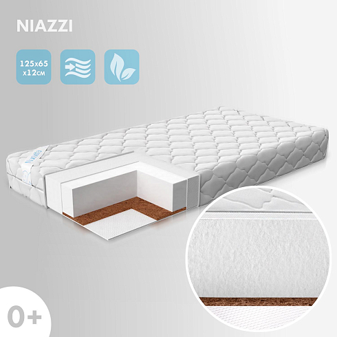 Детский матрас Nuovita Niazzi. Максимальная нагрузка на матрас 30 кг. Состав наполнителя: кокос 1 см + Forplit 10 см + спанбонд. Жесткость матраса "средняя". Чехол матраса съёмный, выполнен из стеганного трикотажного полотна.