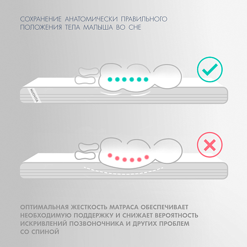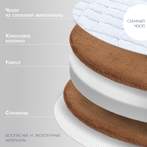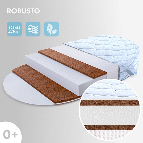 Детский матрас Nuovita Robusto. Максимальная нагрузка на матрас 30 кг. Состав наполнителя: кокос 1 см + Forplit 10см + кокос 1 см спанбонд. Жесткость матраса "средняя". Чехол матраса съёмный, выполнен из стеганной микрофибры.