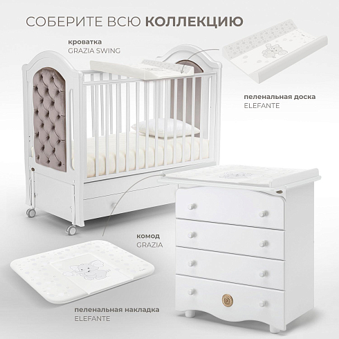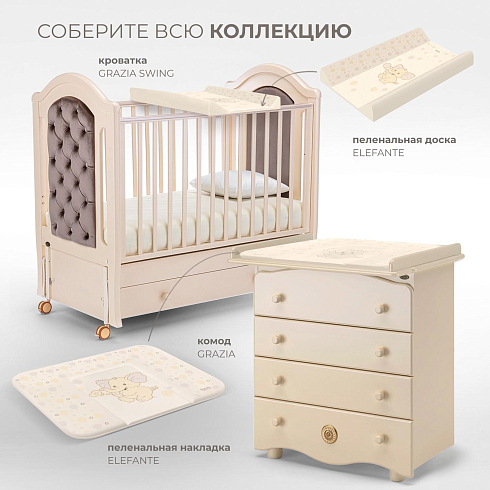 Дизайнеры бренда Nuovita предлагают несколько коллекций мебели для детской комнаты, в которых присутствуют кровати и пеленальные доски. Изделия из одноименных коллекций имеют аналогичную расцветку и украшены запоминающимся принтом. Их использование позволит создать в детской комнате гармоничный интерьер и обойтись без пеленального комода.