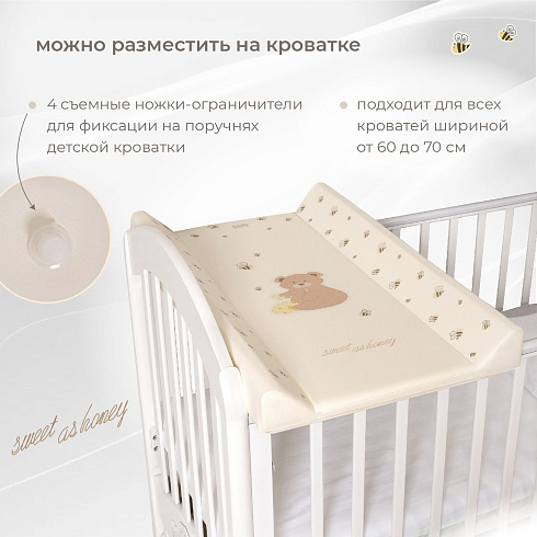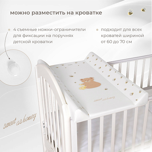 Доска универсальна, ее можно разместить на любой ровной поверхности или зафиксировать на поручнях детской кроватки. Для этого в конструкции предусмотрены съемные ножки-ограничители (6 шт.), благодаря которым доска прочно устанавливается на кровать. Она подходит для всех кроватей шириной от 60 до 70 см и позволяет с максимальным удобством выполнять все гигиенические процедуры ребенку.