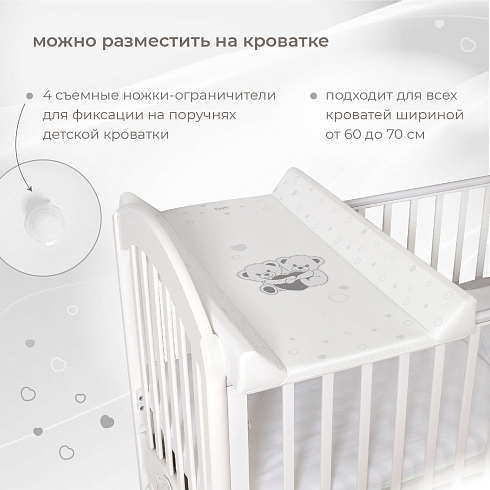 Доска универсальна, ее можно разместить на любой ровной поверхности или зафиксировать на поручнях детской кроватки. Для этого в конструкции предусмотрены съемные ножки-ограничители (6 шт.), благодаря которым доска прочно устанавливается на кровать. Она подходит для всех кроватей шириной от 60 до 70 см и позволяет с максимальным удобством выполнять все гигиенические процедуры ребенку.