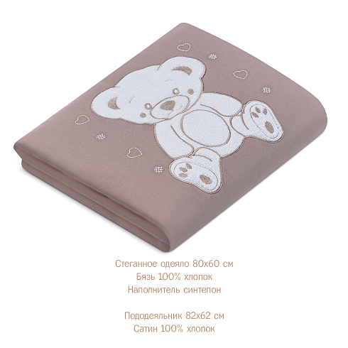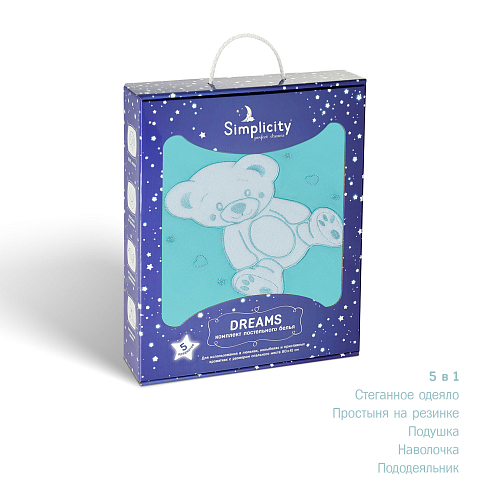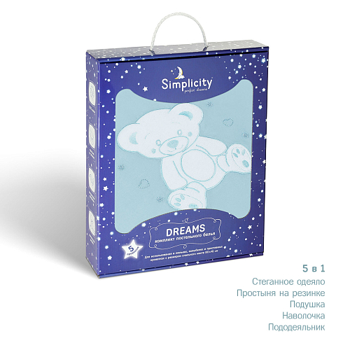 Комплект включает в себя 5 предметов: стеганное одеяло с пододеяльником, удобную простыню на резинке и подушку со съёмной наволочкой.
