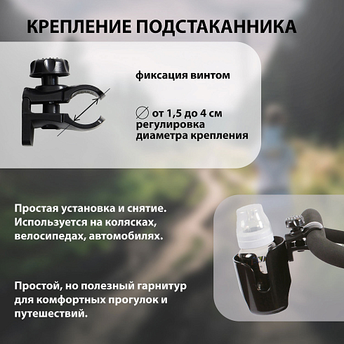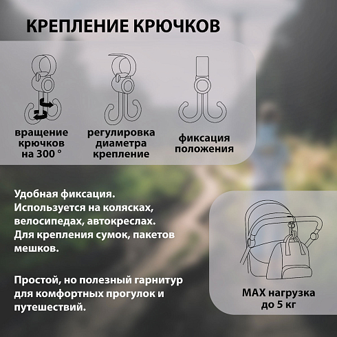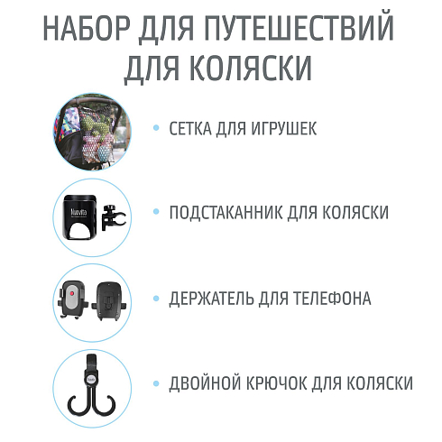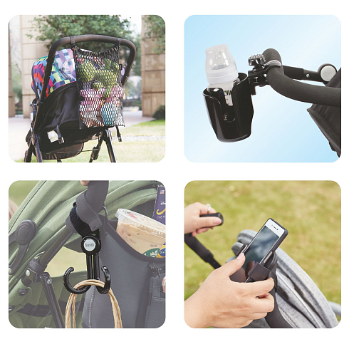 Комплектация: двойной крючок для коляски, держатель для телефона, подстаканник для коляски, сетка для игрушек