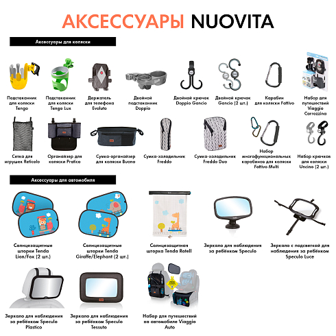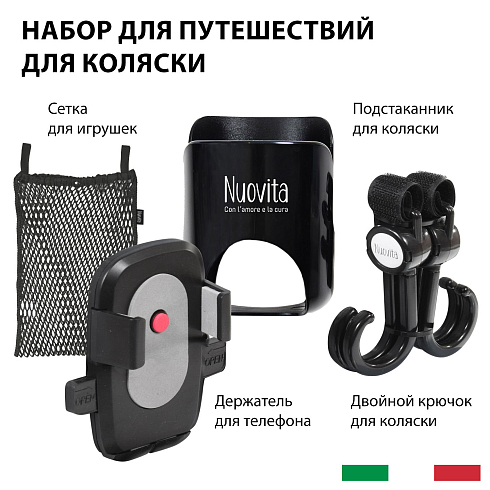 Набор для путешествий Viaggio Carrozzina состоит из двойного крючка для коляски, держателя для телефона, подстаканника для коляски, сетки для игрушек. Универсальный набор подходит для всех моделей колясок. Аксессуары легко устанавливаются и снимаются. Это идеальное решение для удобства во время прогулки и в путешествии.