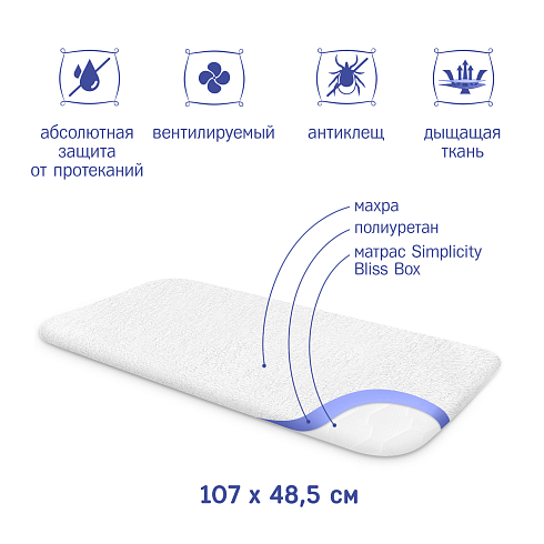 Simplicity Bliss Box — это водонепроницаемый натяжной наматрасник, который благодаря своему водонепроницаемому и дышащему эффекту обеспечивает вентиляцию матраса и 100% защиту от протеканий и любых загрязнений. Он идеально подходит для матрасов Simplicity Bliss Box, а также может использоваться совместно с другими матрасами размером 107х48.5х3 см.