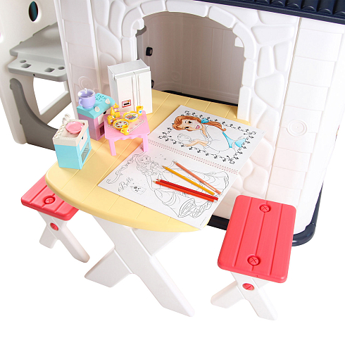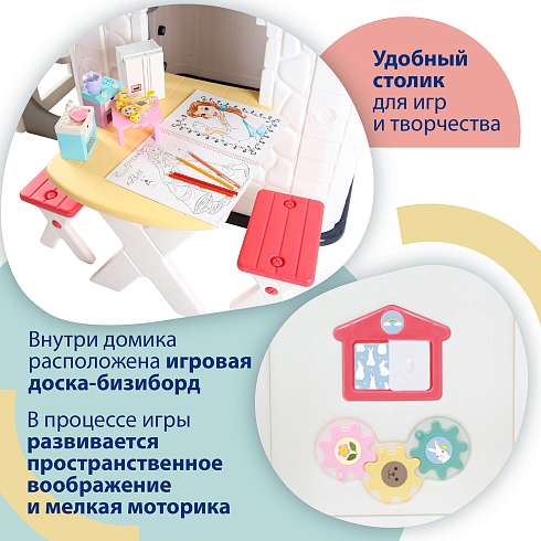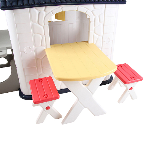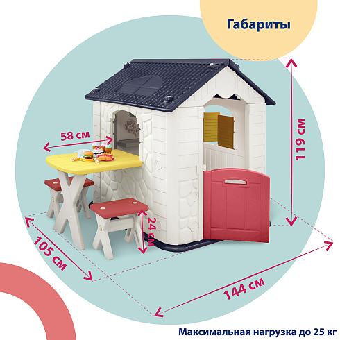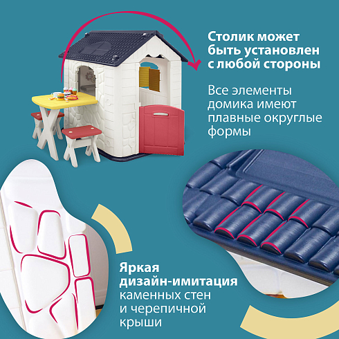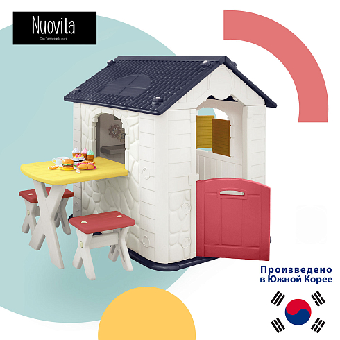 Детский игровой домик Nuovita NHN-705 — это прочный и просторный домик-имитация, в котором ребенок может играть как один, так и с друзьями. Они смогут ходить друг к другу в гости, устроить маленькое чаепитие или порисовать, удобно усевшись на маленьких стульях за настоящим столом. Детский домик выглядит как настоящий — в точности воссоздана текстура стен с имитацией камня, форма черепицы и деревянной доски. Дверь и ставни держатся на надежных креплениях и легко открываются.