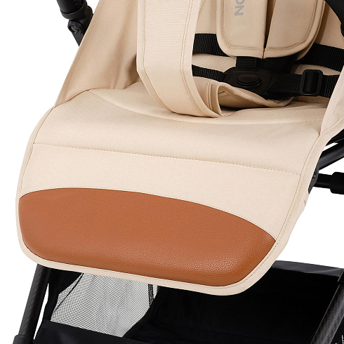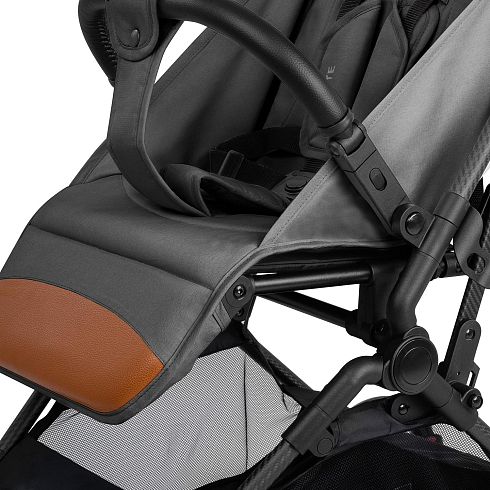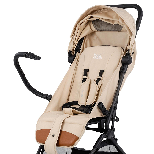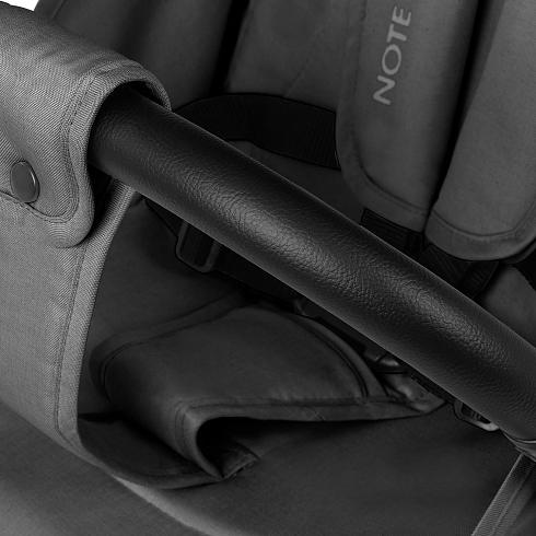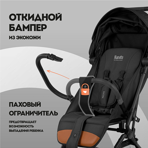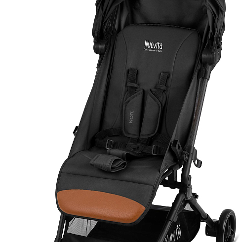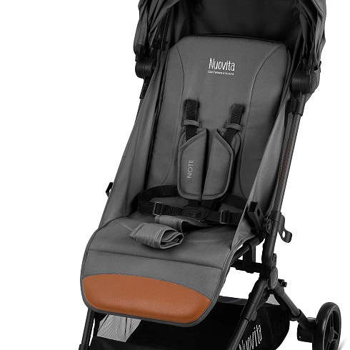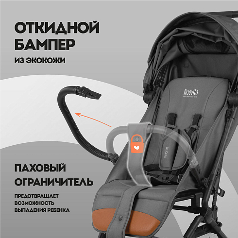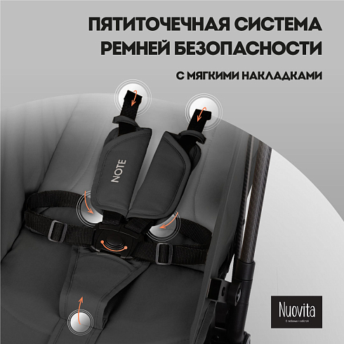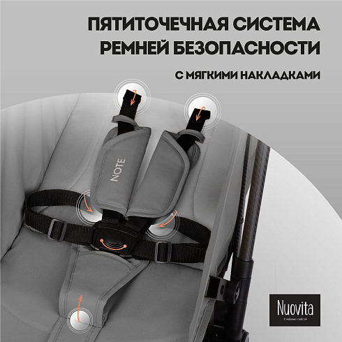 При этом соблюдены все требования безопасности и комфорта, которые выдвигаются к коляске для ребенка: от выпадения и выскальзывания защищает съёмный бампер, удобное положение ног ребенка гарантирует подножка, которая имеет два положения, спинка тоже регулируется (от 115 ° до 175 °). И, разумеется, важным фактором являются ремни безопасности — у Nuovita Note они 5-ти точечные с накладками из мягкого материала.