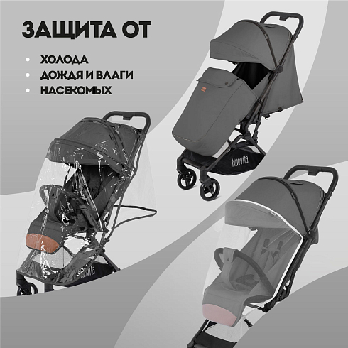 Чтобы обеспечить маленькому путешественнику надлежащий уровень комфорта, коляска-прогулка Nuovita Note поставляется в полной комплектации, включающей все необходимые детали и дополнения: капюшон и козырек на коляску уберегут от яркого солнца, а корзина вместит не только детские игрушки, но и небольшие мамины покупки. В комплект входят чехол (накидка на ноги), плащ-дождевик и москитная сетка. Тканевые элементы коляски изготовлены из тактильно приятного инновационного материала катионика: он не вытягивается, не деформируется и сохраняет стойкость цвета. Все материалы изделия отличаются прочностью, практичностью в уходе и долговечностью.