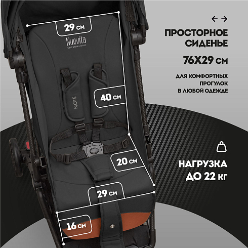 Благодаря прочной конструкции из карбона (а он гораздо прочнее и легче стали!) и надежному шасси детская коляска Nuovita Note может использоваться как всесезонная и универсальная коляска. Хорошая проходимость, качественная амортизация с дополнительной системой ANTISHOCK на передних колесах и повышенная маневренность позволяют ее использовать не только на тротуарах, но и за городом, а дождевик на прогулочную коляску, выполненный из прочных и износостойких материалов, защитит малыша не только от летних дождей, но и от осенней непогоды. Модель выпускается в нейтральных оттенках, поэтому может использоваться и как коляска для мальчиков, и как коляска для девочек. При этом её хватит надолго: если большинство прогулок предусмотрены для детей весом до 15 кг, то Nuovita Note рассчитана на нагрузку до 22 кг.