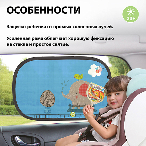 Солнцезащитные шторки Tenda Giraffe\Elephant для автомобиля – это аксессуар, который защитит ребенка от ярких солнечных лучей во время поездки в автомобиле. Выполнены из прочного полиэстера,  окантовка из гибкого ПВХ. Фиксируются на стекло автомобиля при помощи одностороннего бесклеевого слоя (пленка прилегает плотно к стеклу и не дает шторке падать). Шторки подходят для автомобилей любой модели, просты в установке и  легко чистятся. Помогают сохранить прохладу внутри автомобиля. В комплекте 2 шторки.